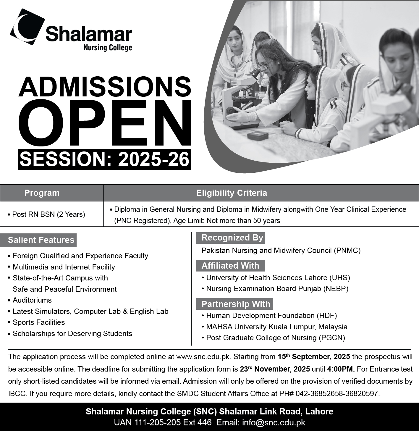The Shalamar Nursing College (SNC) was established in 2006 and continues to provide excellence and leadership in nursing education in Pakistan. The college offers a four-year graduate nursing program and specialized post-nursing diploma programs. Our alumni are placed among the best hospitals locally and internationally.